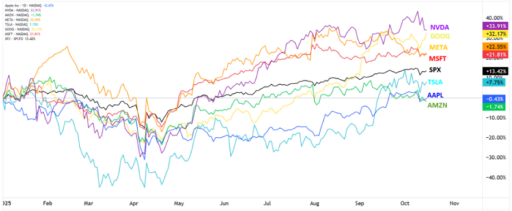 Since flipping the calendar to 2025, the individual differences between these massive entities have become more stark, with laggards like Apple and Amazon (NASDAQ:) falling despite generally bullish conditions and standouts like Nvidia (NASDAQ:) and Alphabet gaining more than 30% year-to-date: