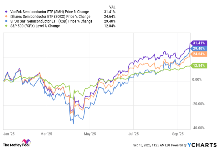 Semiconductor stocks and artificial intelligence (AI) are ruling the stock market this year. While the benchmark S&P 500 is up 12% so far in 2025, major semiconductor exchange-traded funds are by far outperforming the market.