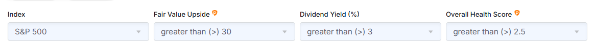 Here’s what that looks like in terms of search criteria on the Investing.com screener: