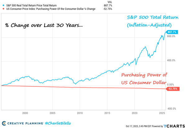 If you can’t see the chart, over the last 30 years, while the S&P has climbed nearly 900%, the purchasing power of the dollar has collapsed by 52.75%.