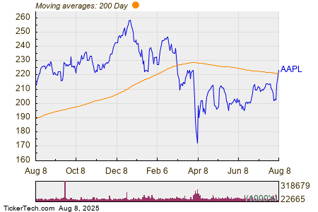 In trading on Friday, shares of Apple Inc (Symbol: AAPL) crossed above their 200 day moving average of $221.13, changing hands as high as $223.57 per share. Apple Inc shares are currently trading up about 1.3% on the day. The chart below shows the one year performance of AAPL shares, versus its 200 day moving average: