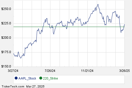 Below is a chart showing the trailing twelve month trading history for Apple Inc, and highlighting in green where the $220.00 strike is located relative to that history: