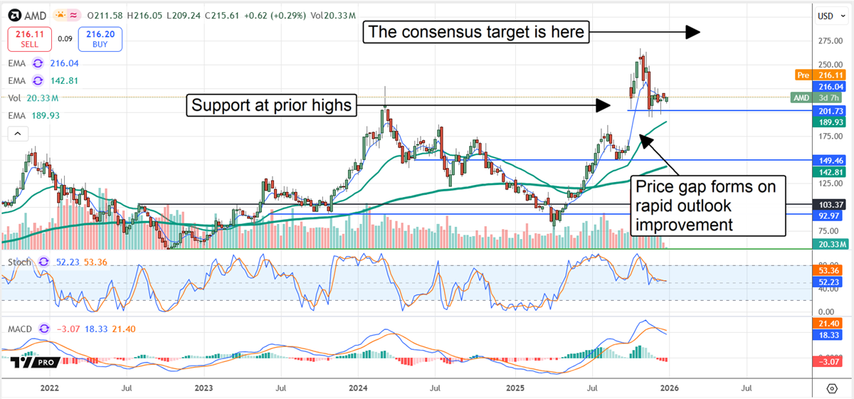 It implies a 30% upside in 2026, and the high-end range, likely to increase as the year progresses, adds nearly 40% in potential upside. The consensus target of $277 would be sufficient to set a new all-time high, breaking the market out of its consolidation.