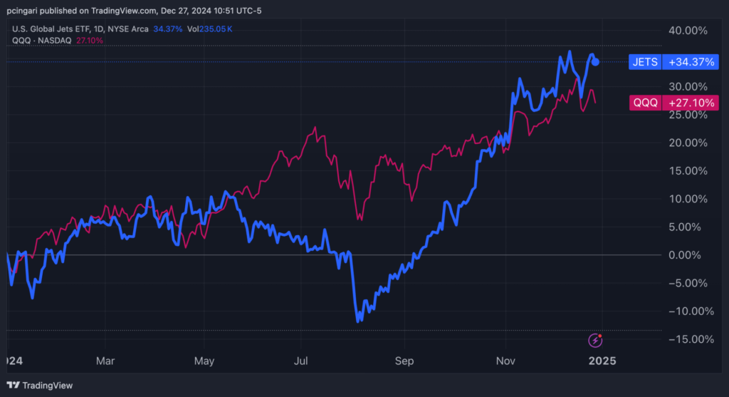 The airline industry has taken off in 2024, outpacing even the high-flying tech sector. The U.S. Global Jets ETF JETS, a fund that tracks the airline sector, is up 34% year-to-date as of Dec. 27, compared to the Nasdaq 100’s 27% gain.