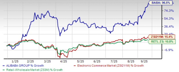 BABA shares have surged 96.5% in the year-to-date period, outperforming the Zacks Internet – Commerce industry and the Zacks Retail-Wholesale sector’s growth of 15.4% and 10.8%, respectively.