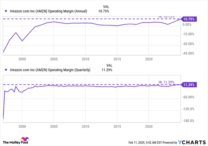 Amazon considers operating income its baseline profitability metric, but it also reported its highest-ever annual profit margin at 9.3%. These margins mean that Amazon is at peak profitability, historically speaking.