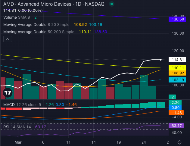 Advanced Micro Devices Inc. AMD has been heating up, and the charts confirm it – the stock is riding a strong bullish trend. Trading above its five-day, 20-day and 50-day exponential moving averages, AMD stock is flashing bullish signals left and right.
