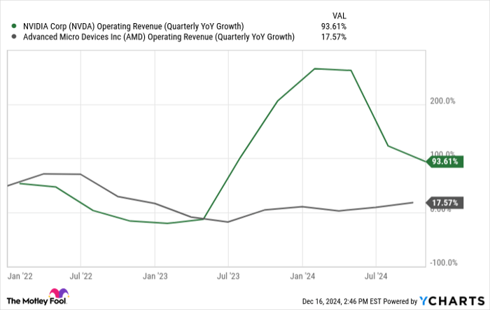 According to AMD, the MI325X chip it launched recently is 30% faster than Nvidia’s H200. If that’s the case, it could offer some competition to the GPU leader, provide AMD with some strong top- and bottom-line growth, and potentially give the stock a much-needed boost in 2025.