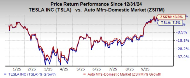 Shares of Tesla have risen roughly 7% year to date compared with the industry’s rise of 13%.