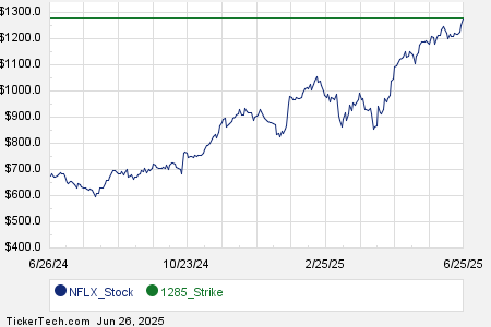 Below is a chart showing the trailing twelve month trading history for Netflix Inc, and highlighting in green where the $1285.00 strike is located relative to that history: