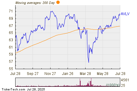 Looking at the chart above, AVLV’s low point in its 52 week range is $55.67 per share, with $71.39 as the 52 week high point — that compares with a last trade of $70.38. Comparing the most recent share price to the 200 day moving average can also be a useful technical analysis technique — learn more about the 200 day moving average ».