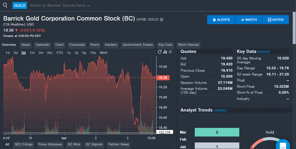 Barrick Gold is expected to report first-quarter financial results later this month. Analysts expect the company to post earnings per share and revenue growth from the year-over-year period. Barrick has beaten analyst estimates for earnings per share in two of the last three quarters, but only four of the past 10 quarters overall. The company has missed revenue estimates in seven of the past 10 quarters, including two straight quarters. With improving prices for gold, investors will be waiting to see if Barrick’s financials improved and what the company is saying about the future.