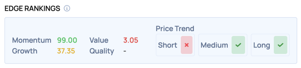 According to Benzinga Edge, the company has momentum on its side, scoring a very high 99 out of 100, though it lags on key valuation metrics, indicating the stock could be overvalued.
