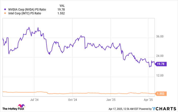 Nvidia’s P/S ratio hovers near a low point for the past year. Intel’s P/S multiple is far below its rival’s, but its poor business performance doesn’t warrant a high valuation.