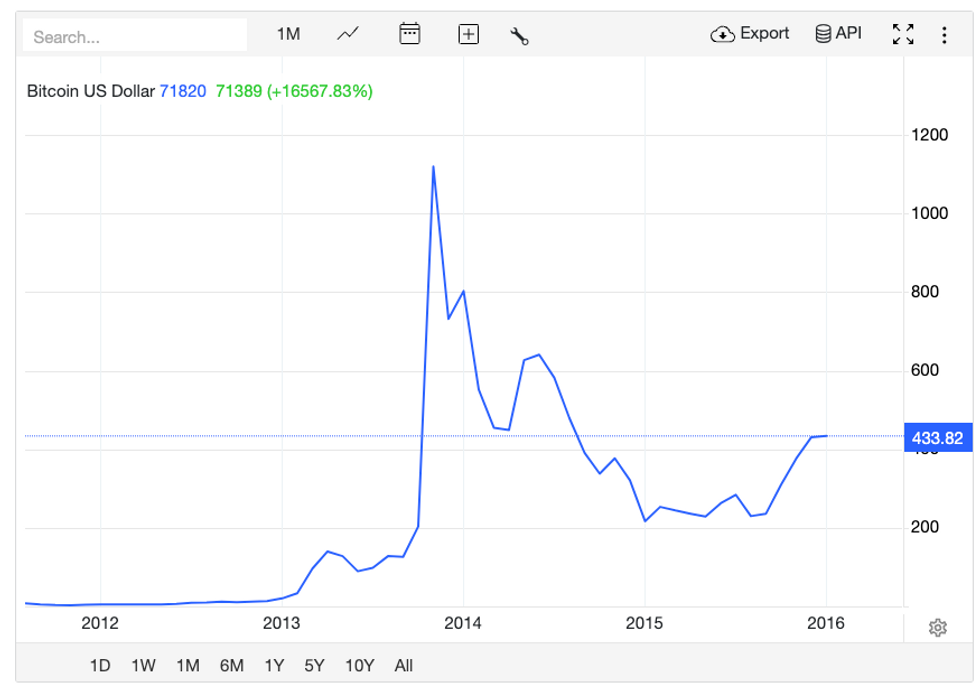 From that peak, Bitcoin’s price began to fall, and it spent most of 2015 in the US$200 range, but it turned around in December 2015 and began to climb again, ending the year at around US$430.