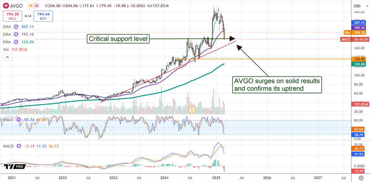 Broadcom stock surged as much as 10% in premarket trading following the Q1 release. The move shows strong support at a critical level that aligns with a prior market top and uptrend. Because of the indicators, the market will likely continue higher and may set a new all-time high in this scenario. The MACD indicator, in particular, shows strength and convergence with the latest high, a signal that it will be retested or exceeded.