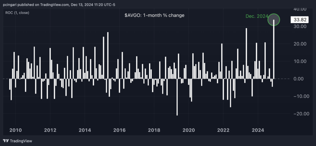 With Friday’s spike, Broadcom’s stock has already rallied 33% in December, marking its strongest monthly performance since going public in 2009.