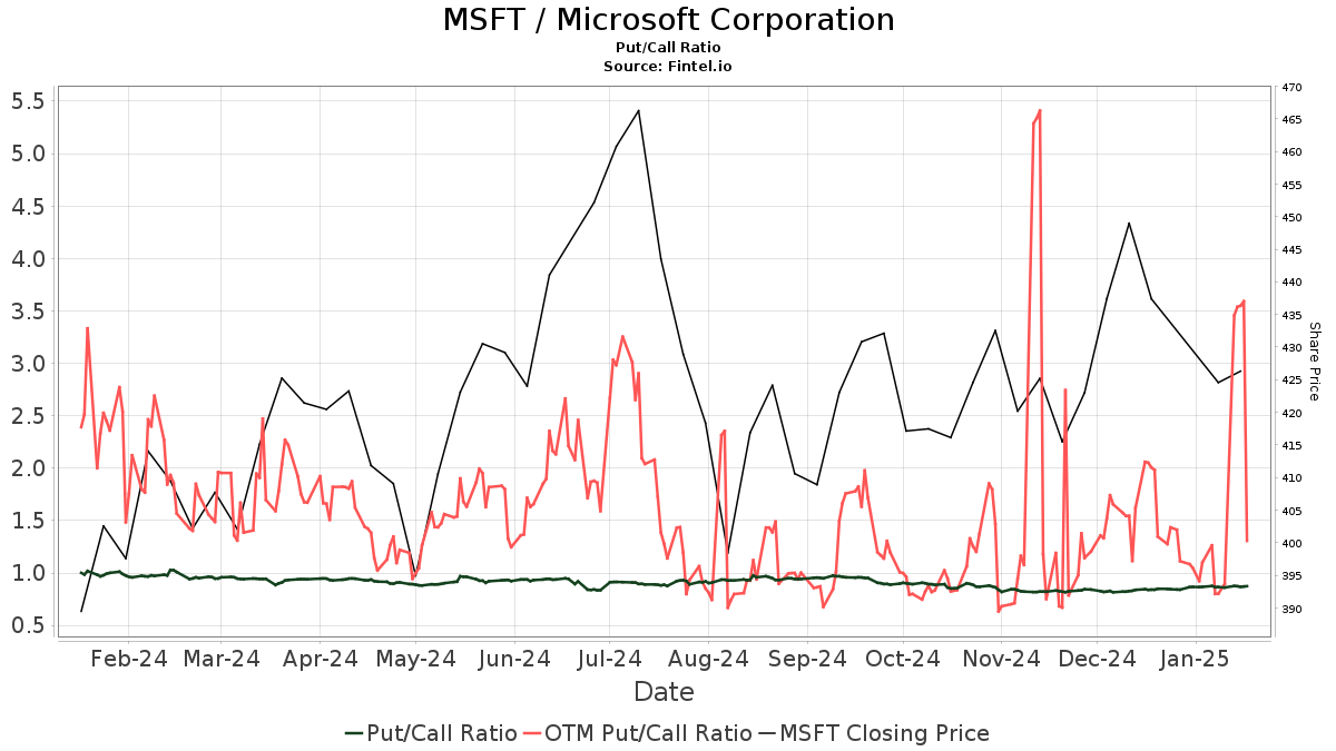 There are 7,696 funds or institutions reporting positions in Microsoft. This is an increase of 89 owner(s) or 1.17% in the last quarter. Average portfolio weight of all funds dedicated to MSFT is 2.82%, an increase of 25.31%. Total shares owned by institutions increased in the last three months by 0.59% to 6,050,033K shares. MSFT / Microsoft Corporation Put/Call Ratios The put/call ratio of MSFT is 0.85, indicating a bullish outlook.