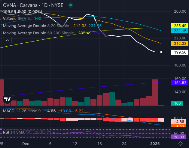 Carvana’s stock has dropped below key simple moving averages (Eight, 20 and 50-day), a textbook sign of a bearish trend. Adding to the challenges: