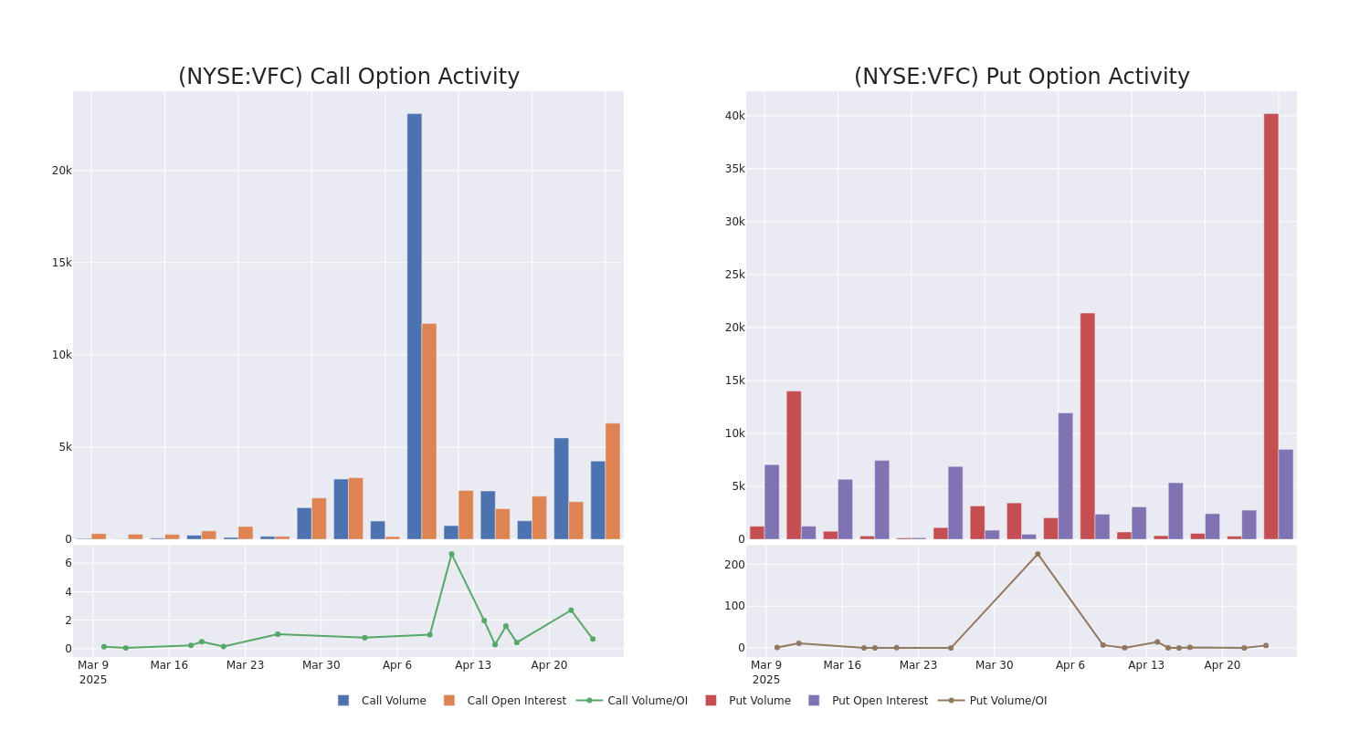 After evaluating the trading volumes and Open Interest, it’s evident that the major market movers are focusing on a price band between $5.0 and $15.0 for VF, spanning the last three months.