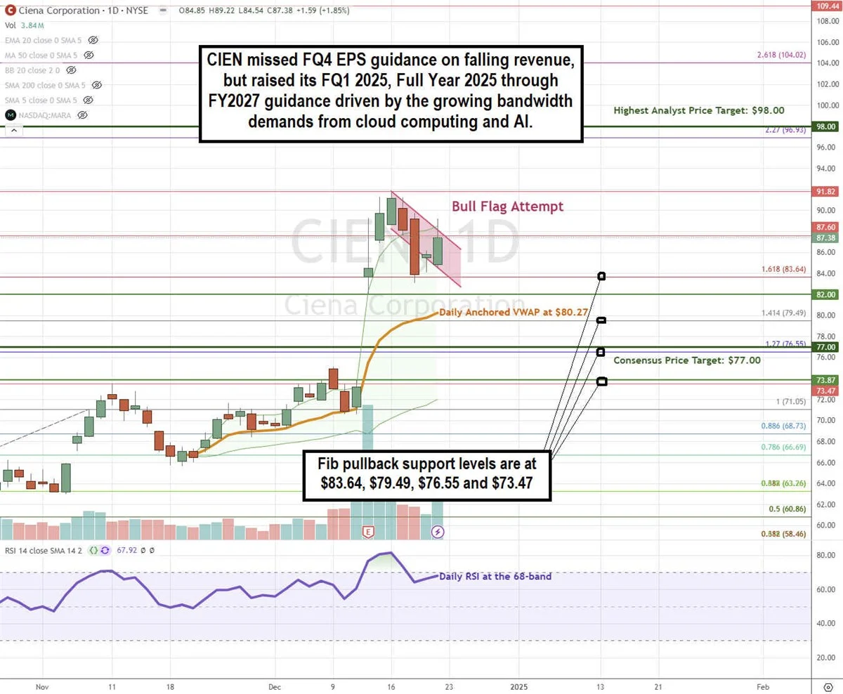 CIEN triggered a gap of up to $82.00 following its FQ4 2024 earnings conference call to form gap-fill levels at $73.87 and $82.00. CIEN continued to grind higher for the next two days, reaching a flagpole peak of $91.82. The flag formed on the parallel descending trendlines with a bull flat trigger on the breakout above $87.60. The daily VWAP support is rising at $80.27. The daily RSI is slowly rising at the 68-band. Fibonacci (Fib) pullback support levels are at $83.64, $79.49, $76.55, and $73.47.