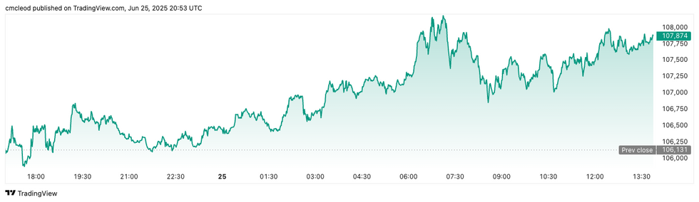Bitcoin (BTC) is priced at US$107,736, an increase of two percent in the last 24 hours. The day’s range for the cryptocurrency brought a low of US$107,027 and a high of US$108,116.