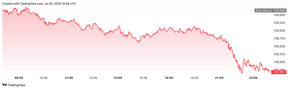 Bitcoin (BTC) is priced at US$108,948, down by 1.6 percent in the last 24 hours. The day’s range for the cryptocurrency brought a low of US$107,741 and a high of US$109,997.