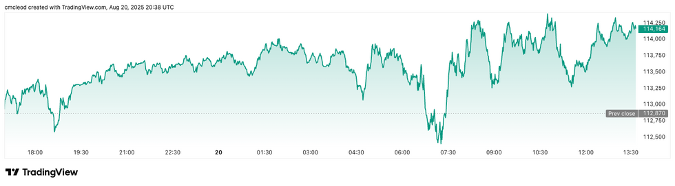 Bitcoin (BTC) was priced at its highest valuation of the day at US$114,179, a modest 0.8 percent increase in 24 hours. Its lowest valuation of the day was US$112,460.