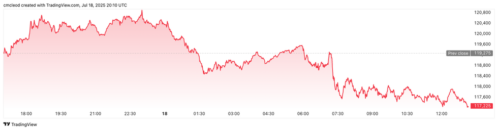Bitcoin price performance, July 18, 2025.