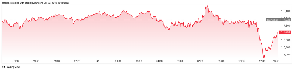 Bitcoin price performance, July 30, 2025.