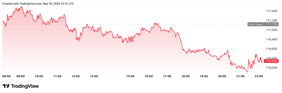 Bitcoin (BTC) was priced at US$116,312, a one percent decrease in 24 hours. Its lowest valuation of the day was US$116,111, and its highest was US$117,888.