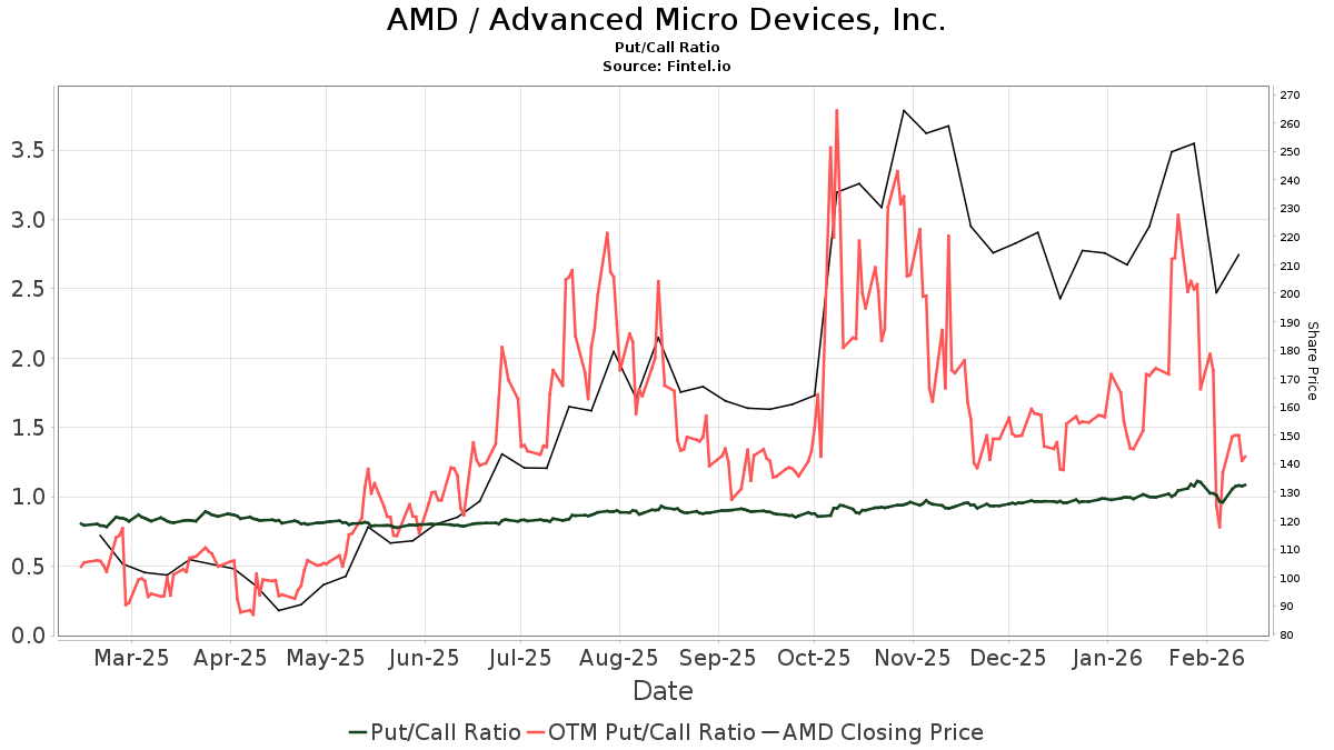 There are 3,874 funds or institutions reporting positions in Advanced Micro Devices. This is an increase of 87 owner(s) or 2.30% in the last quarter. Average portfolio weight of all funds dedicated to AMD is 0.55%, an increase of 5.27%. Total shares owned by institutions increased in the last three months by 3.36% to 1,197,799K shares. AMD / Advanced Micro Devices, Inc. Put/Call Ratios The put/call ratio of AMD is 1.10, indicating a bearish outlook.