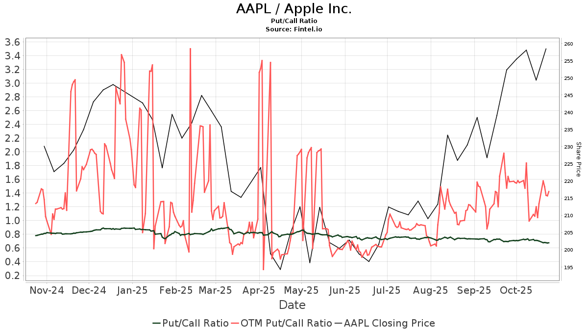 There are 7,680 funds or institutions reporting positions in Apple. This is an decrease of 11 owner(s) or 0.14% in the last quarter. Average portfolio weight of all funds dedicated to AAPL is 3.04%, an increase of 8.84%. Total shares owned by institutions increased in the last three months by 1.63% to 10,615,355K shares. AAPL / Apple Inc. Put/Call Ratios The put/call ratio of AAPL is 0.68, indicating a bullish outlook.