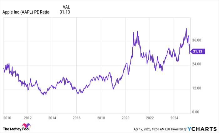 Amid those challenges, investors must also contend with its price-to-earnings (P/E) ratio of 31. While that earnings multiple has fallen since late last year, it is well below the P/E ratios for most of the 2010s. At that time, Apple typically traded under 20 times earnings, even as revenue grew by double-digit percentages. When considering today’s slower revenue growth, one has to wonder whether Apple stock is worth this premium valuation.