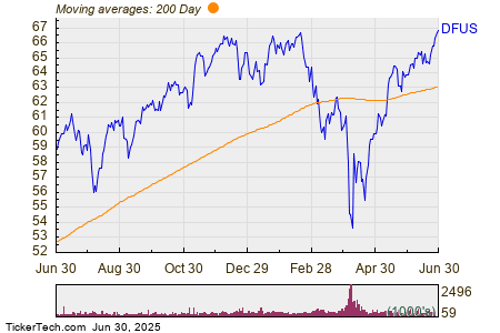 Looking at the chart above, DFUS’s low point in its 52 week range is $52.0953 per share, with $66.97 as the 52 week high point — that compares with a last trade of $66.87. Comparing the most recent share price to the 200 day moving average can also be a useful technical analysis technique — learn more about the 200 day moving average ».