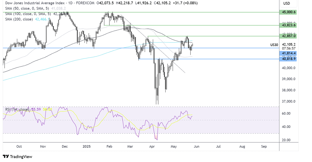 The extended its recovery to 42,880 before turning lower, taking out the 200 SMA and spiking to a low of 41,163, before recovering back above the 42,000 round number. This combined with the RSI above 50, keeps buyers hopeful of further gains. Buyers would need to rise above the 200 SMA to bring 42,880 back into focus.
