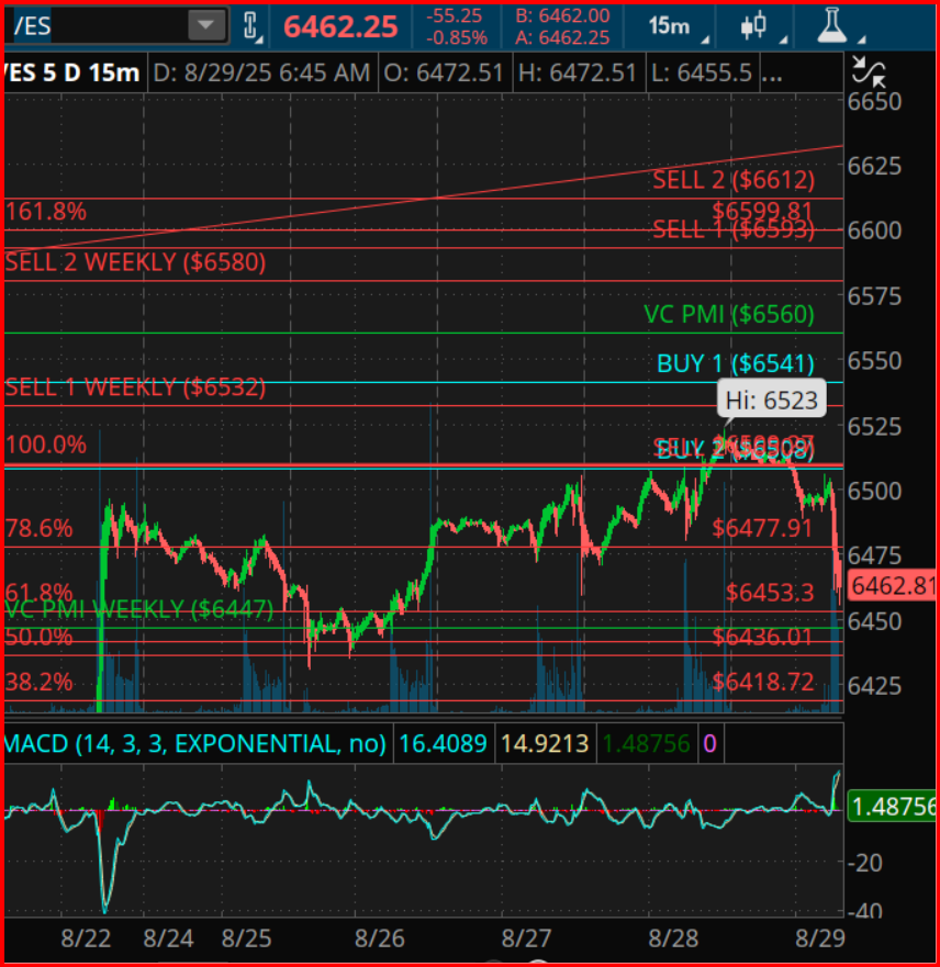 The convergence of VC PMI, Fibonacci, and Gann cycles provides a rare moment of clarity: the market is sitting on the edge of short-term weakness but within a long-term topping rhythm. The most probable path is continued mean reversion toward 6430–6418 before the next cycle pivot arrives in early September.