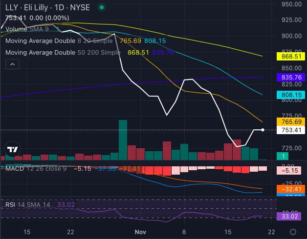 Lilly stock is well below its summer highs and is trading at $746.94 at the time of writing. The once red-hot obesity drugmaker is in the crosshairs of bearish technicals and political uncertainty.