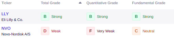 As you can see above, Eli Lilly currently carries a B-rating, while Novo Nordisk holds a D-rating – a clear divergence in earnings momentum, sales growth, relative strength and institutional support.