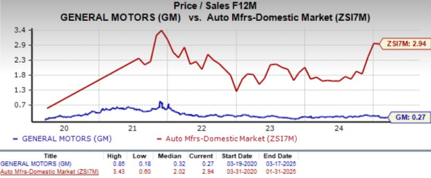 U.S. legacy automaker General Motors GM is trading quite cheap at the moment from a valuation standpoint despite record financials and strong fundamentals. With a forward sales multiple of just 0.27 — below its five-year average and industry — GM presents an attractive value opportunity. It has a Value Score of A.