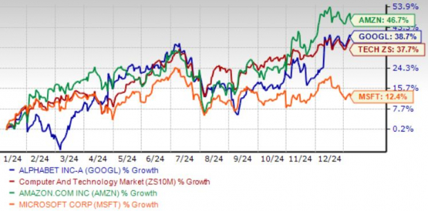 Despite stiff competition in the cloud and AI domains, GOOGL shares have returned 38.7% in the trailing 12 months, outperforming the Zacks Computer & Technology sector and Microsoft but lagging AMZN. Over the same timeframe, the sector has returned 37.7%, while MSFT and AMZN have appreciated 12.4% and 46.7%, respectively.