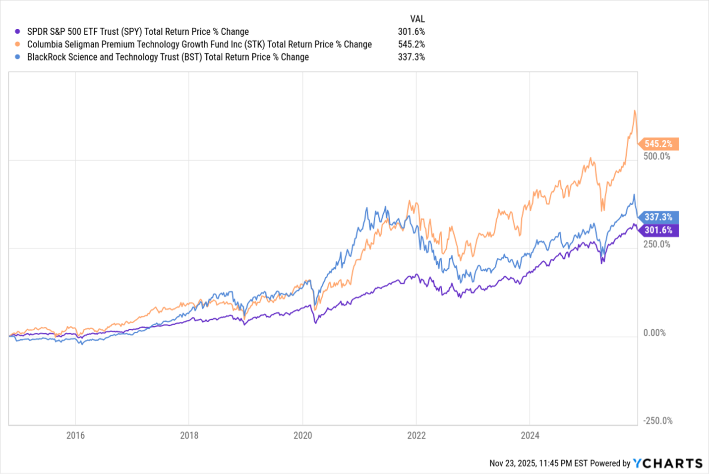 I should note before we go further, though, that the two CEFs we’ll get into below–the BlackRock Science and Technology Trust (BST) and the Columbia Seligman Premium Technology Growth Fund (STK)–have much lower fees: about 1.1% each.