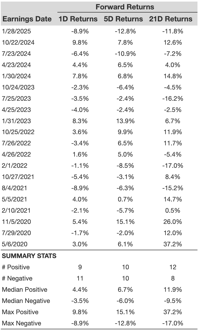 - There are 20 earnings data points recorded over the last five years, with 9 positive and 11 negative one-day (1D) returns observed. In summary, positive 1D returns were seen about 45% of the time.