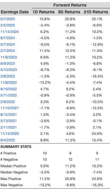 - There are 20 earnings data points recorded over the last five years, with 10 positive and 10 negative one-day (1D) returns observed. In summary, positive 1D returns were seen about 50% of the time.