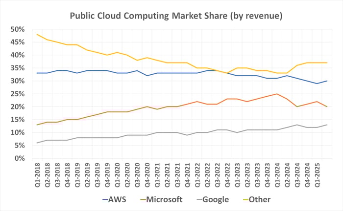 There’s an important detail, however, being left out of the discussion. That’s the fact that AWS is more than twice as big as either of the two top rivals. In fact, data compiled by Synergy Research Group indicates that with its 30% share of the global cloud market’s total revenue, Amazon’s cloud business is 50% bigger than next-nearest Microsoft. And while Microsoft’s total Q2 cloud revenue improved year over year, it’s been losing market share since early last year. Amazon’s share at least ticked a little higher last quarter.