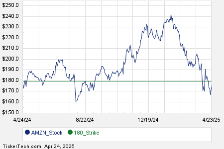 Below is a chart showing the trailing twelve month trading history for Amazon.com Inc, and highlighting in green where the $180.00 strike is located relative to that history: