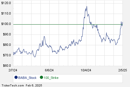 Below is a chart showing the trailing twelve month trading history for Alibaba Group Holding Ltd, and highlighting in green where the $100.00 strike is located relative to that history: