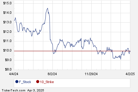 The call contract at the $10.00 strike price has a current bid of 7 cents. If an investor was to purchase shares of F stock at the current price level of $9.85/share, and then sell-to-open that call contract as a “covered call,” they are committing to sell the stock at $10.00. Considering the call seller will also collect the premium, that would drive a total return (excluding dividends, if any) of 2.23% if the stock gets called away at the May 23rd expiration (before broker commissions). Of course, a lot of upside could potentially be left on the table if F shares really soar, which is why looking at the trailing twelve month trading history for Ford Motor Co., as well as studying the business fundamentals becomes important. Below is a chart showing F’s trailing twelve month trading history, with the $10.00 strike highlighted in red: