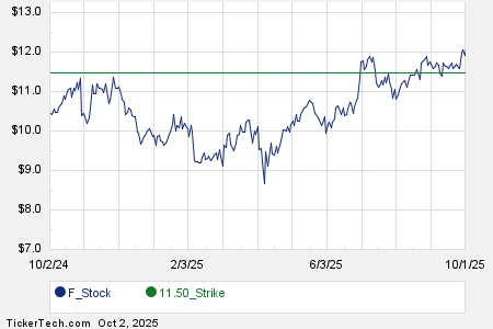 Below is a chart showing the trailing twelve month trading history for Ford Motor Co., and highlighting in green where the $11.50 strike is located relative to that history: