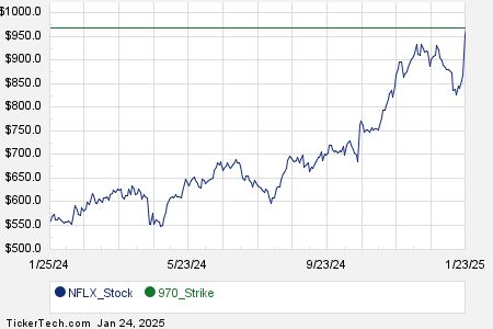 Below is a chart showing the trailing twelve month trading history for Netflix Inc, and highlighting in green where the $970.00 strike is located relative to that history: